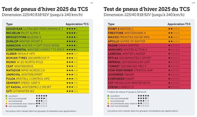 Pour guider les automobilistes dans leur choix, le Touring Club Suisse a testé 31 pneus d’hiver. Plus d’un tiers des pneus examinés n’ont pas réussi les tests et sont jugés non recommandés. Tous les modèles non recommandés sont les moins chers du test. Sur route mouillée, les distances de freinage des modèles les plus faibles peuvent être supérieures de plus de 15 mètres, représentant un risque potentiellement mortel.